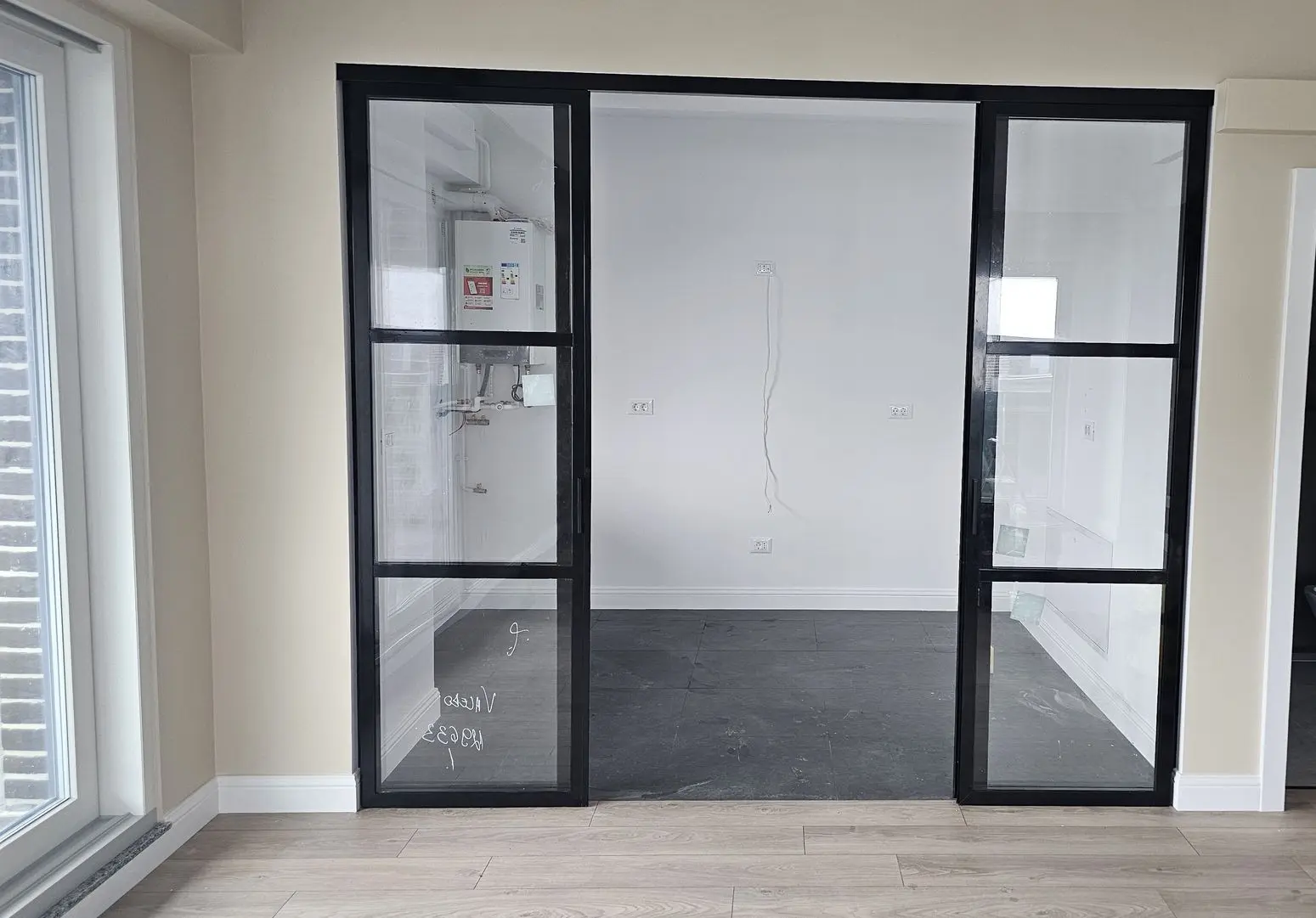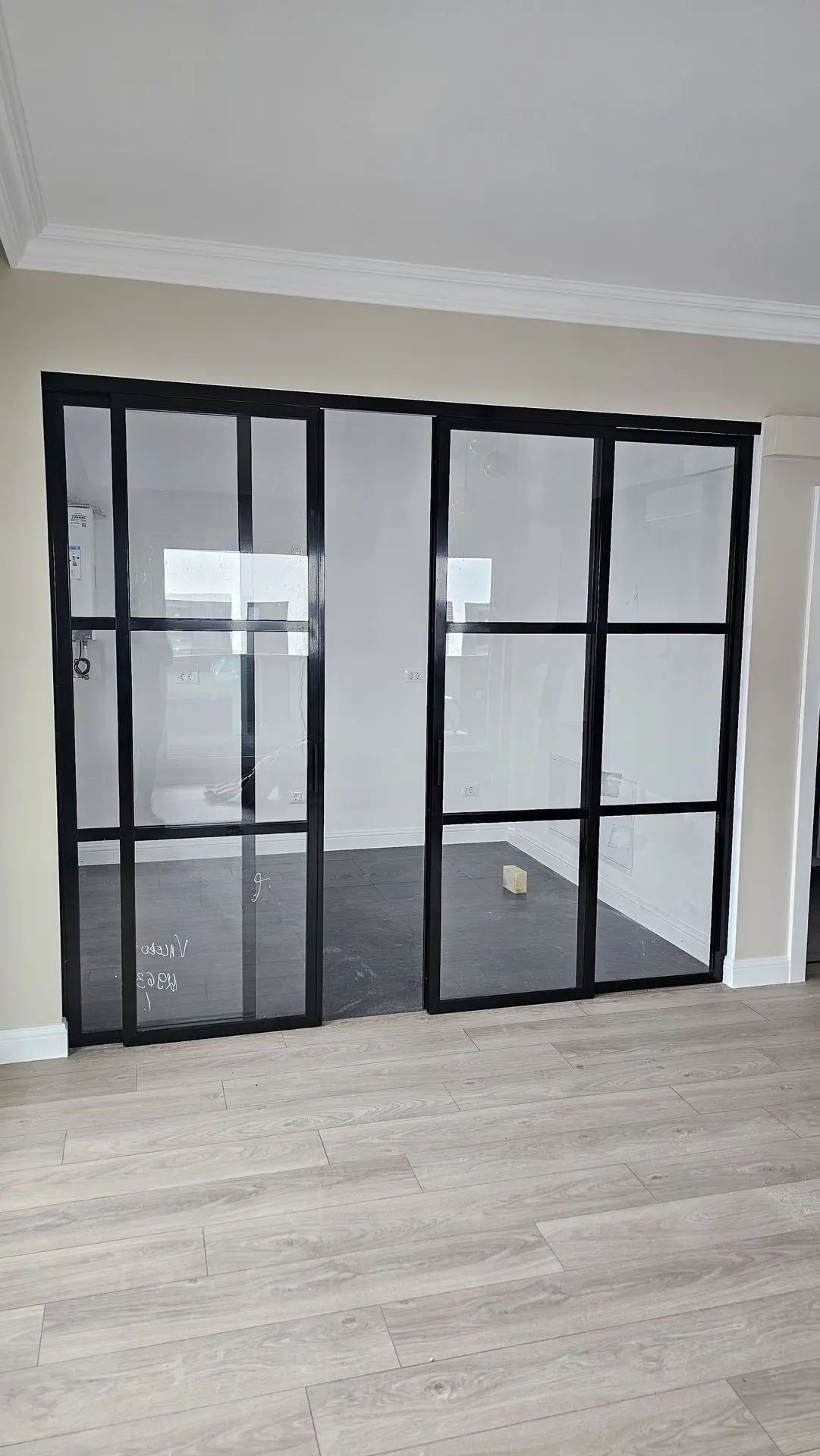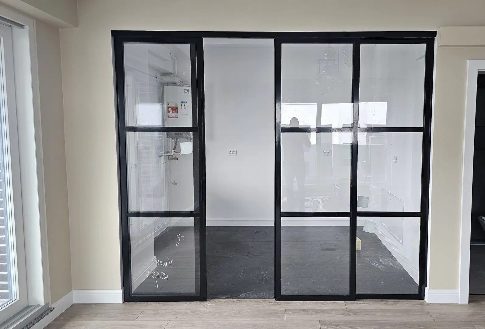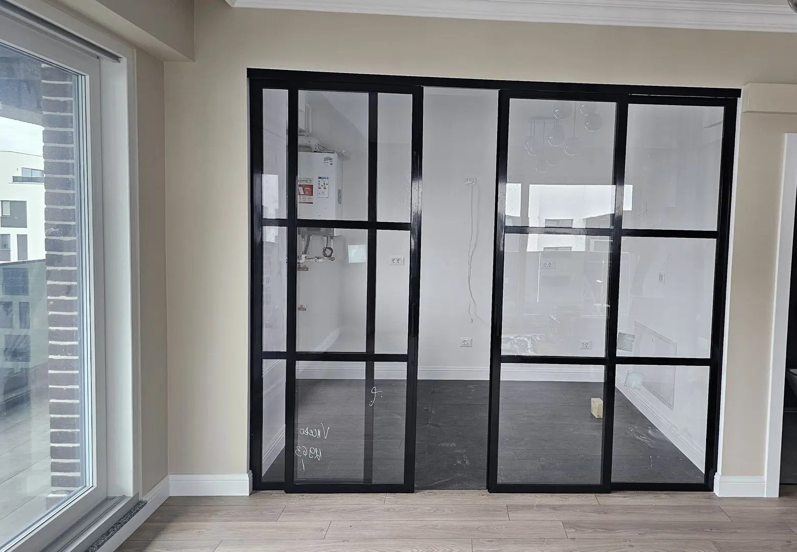 Pentru a obține un cadru uniform și proporții corecte, a fost necesară o măsurare foarte precisă, adaptată înălțimii camerei și liniilor existente din apartament. Echipa Crystal Glass Thermo SRL a calibrat dimensiunile panourilor și poziționarea sistemului astfel încât compartimentarea să se așeze perfect în amenajare, atât vizual, cât și funcțional.