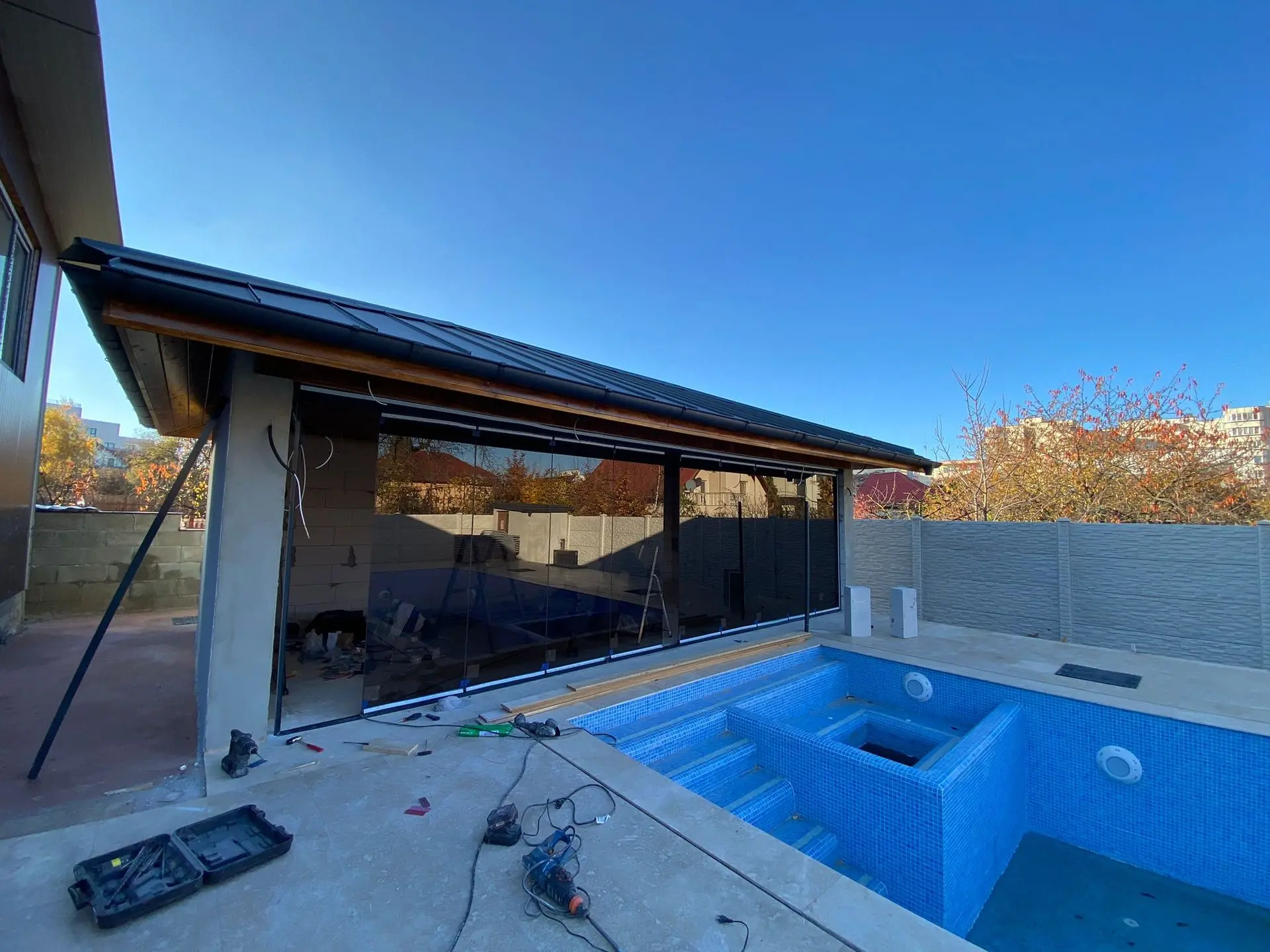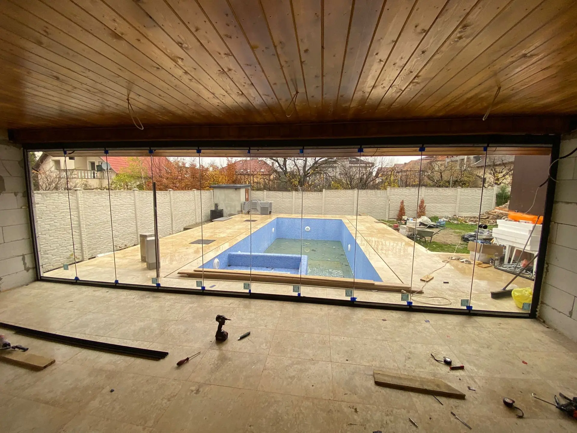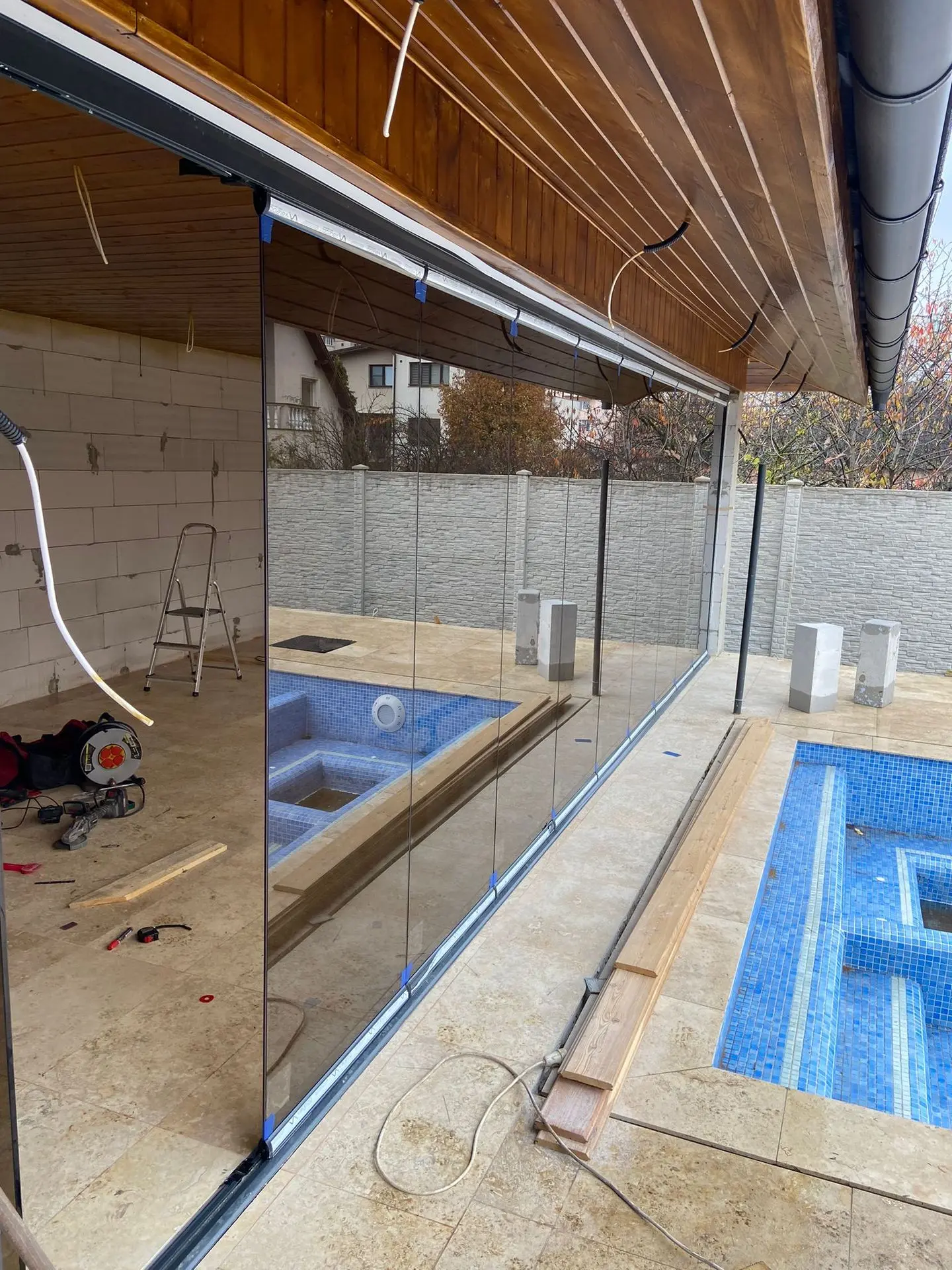 La o locuință din Cluj, proprietarul și-a dorit o soluție estetică de închidere a foișorului, păstrând cât mai mult din senzația de spațiu deschis. Cerința principală a fost ca suprafața vitrată să fie formată exclusiv din sticlă, fără profile vizibile din PVC sau aluminiu, pentru un design curat și elegant. Sistemul glisant Valedo BKS-T s-a dovedit soluția potrivită pentru a obține transparență, protecție și continuitate vizuală.