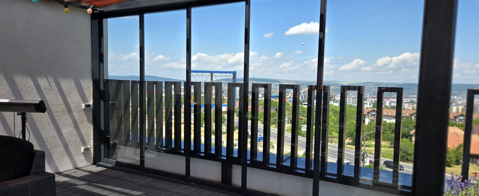 În Cluj, terasa situată pe acoperișul casei, expusă vântului și elementelor atmosferice, a fost echipată cu sistemul glisant Valedo BKS-T pentru a putea fi utilizată indiferent de condițiile meteo. Soluția oferă protecție și transparență, menținând vederea panoramică asupra orașului.