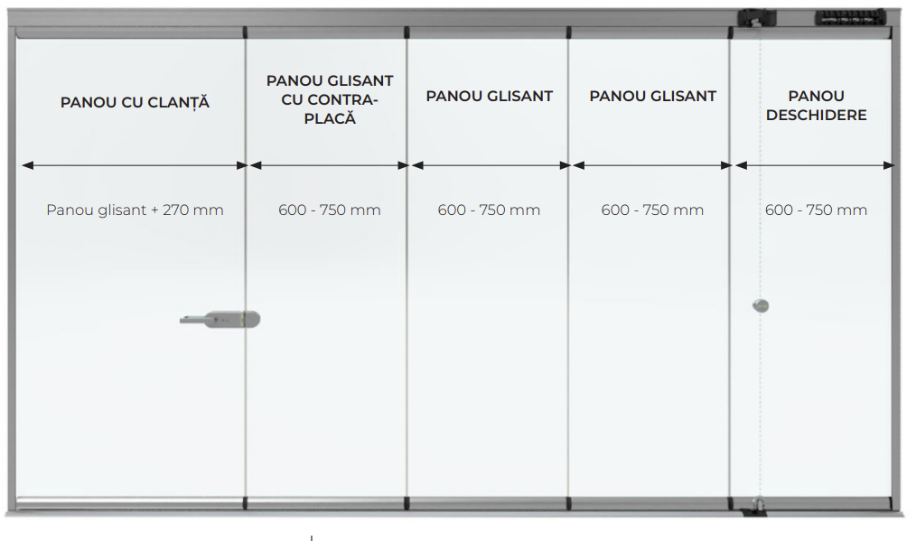 - Lățime per panou: între 600 mm și 750 mm (excepție la ușa cu clanță, care poate avea până la 1000 mm)