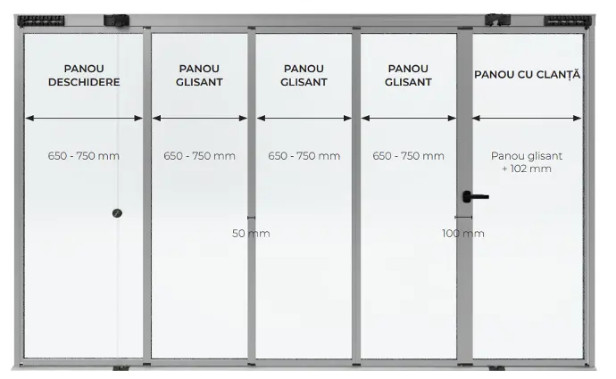 - Lățime per panou: între 650 mm și 750 mm (excepție la ușa cu clanță, care poate avea până la 860 mm)