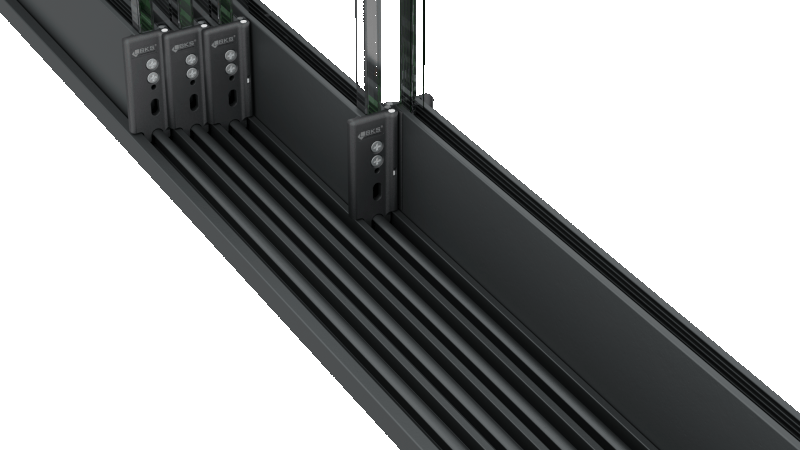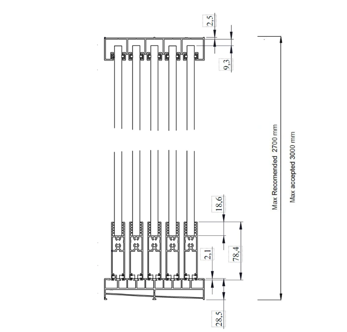 Greutatea sistemului este preluată în partea inferioară. Rolele glisante sunt amplasate jos, iar șina inferioară susține și distribuie greutatea, contribuind la o funcționare lină și fiabilă în timp.