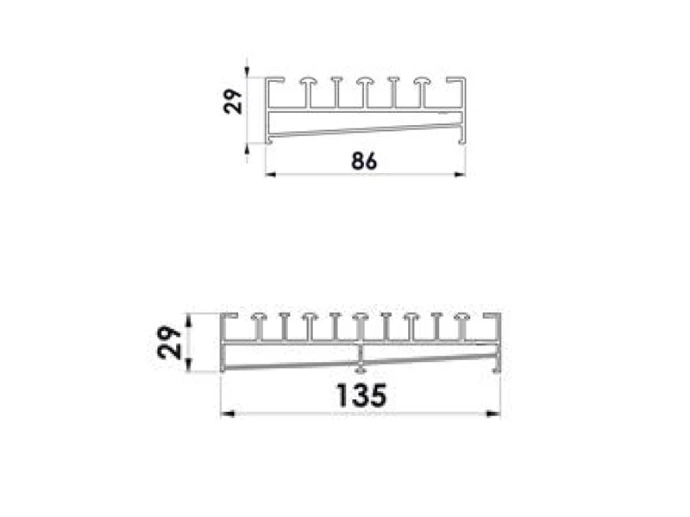 Șina inferioară este concepută pentru preluarea greutății panourilor și pentru integrare discretă în zona de trecere. În materialele comerciale folosite în ofertare, aceasta este prezentată ca având un profil redus, în jurul valorii de 29 mm, și canal de drenaj integrat, pentru o utilizare mai practică în condiții de exterior. În nomenclator și în catalogul tehnic apar atât variante cu prag, cât și fără prag, pentru 3 și 5 canale.