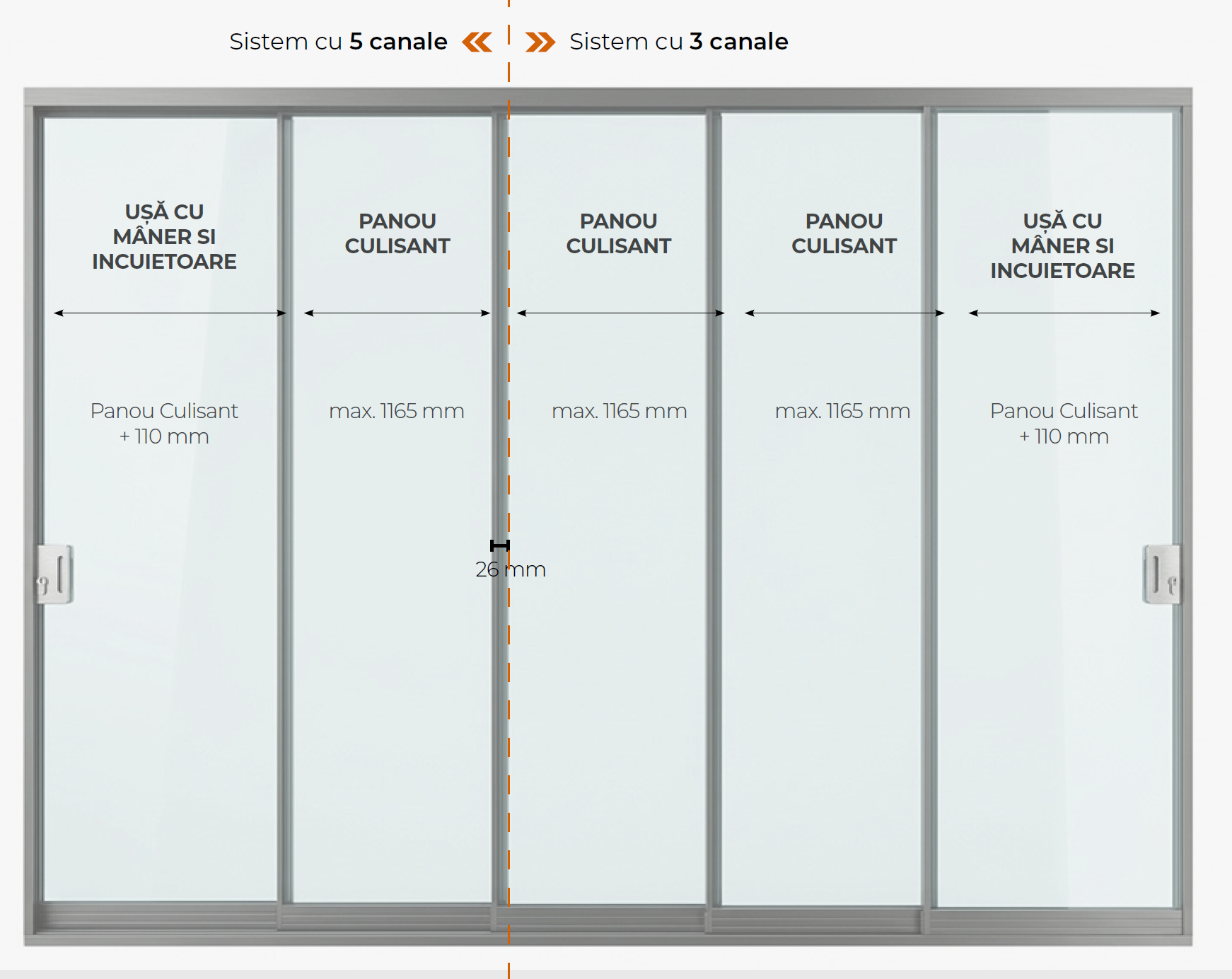 In funcție de variantă,documentația existentă indică lățimi uzuale de panou în jurul intervalului 800–1165 mm și lungimi totale diferite pentru configurațiile cu 3 sau 5 canale. Aceste valori trebuie întotdeauna corelate cu configurația exactă a proiectului.